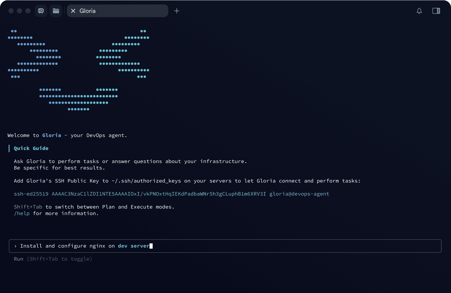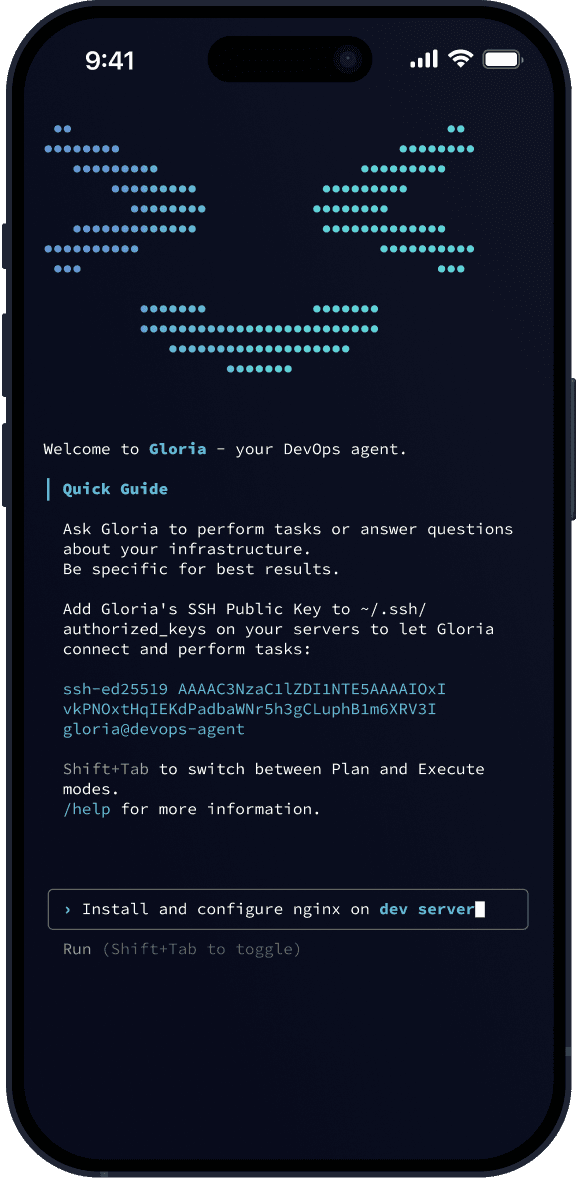Each user gets an isolated Gloria instance accessible via SSH. You can start a task from your laptop and check the progress later from your mobile.